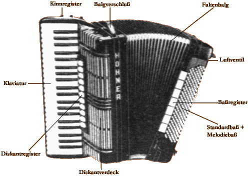 Das „moderne“ Akkordeon besteht im Wesentlichen aus drei Teilen : der Diskantseite (entweder mit Piano- oder Knopfgrifftastatur), dem Faltenbalg und der Bassseite. Es wird beim Spielen durch Schulterriemen festgehalten. Die rechte Hand spielt die Diskantseite, die linke Hand spielt die Bassseite und bewegt gleichzeitig durch Ziehen oder Drücken den Faltenbalg. Durch Hinunterdrücken einer Taste und gleichzeitige Zug- oder Druckbewegung am Balg wird Luft in das Akkordeon hineingesogen bzw. herausgepresst. Im Inneren des Diskantteils sind, von innen ausgehöhlte, Stimmstöcke aus Holz montiert, auf denen Stimmplatten mit freischwingenden metallischen Stimmzungen festgewachst sind. Dieses Spezialwachs (Bienenwachsbasis) soll verhindern, dass die Luft anderweitig entweicht. Die Luft wird durch Kanzellen (Kanäle) zu den Stimmplatten geführt und schließlich an den Stimmzungen vorbei durch den „Stimmschlitz“ gepresst, wobei dann eben die Stimmzungen zum Schwingen gebracht werden, wodurch schließlich der Ton erzeugt wird (s.u.). Dabei sind auf jeder Stimmplatte zwei Stimmzungen aufgenietet. Die eine Stimmzunge „reagiert“ auf Druckluft, die Andere auf Saugluft. Bei den heutigen Akkordeons reagieren die Stimmzungen gleichtönig, d.h. bei Zug oder Druck mit demselben Ton. Nebenbei besitzen die meisten Akkordeons Registertasten. Durch Drücken dieser Register können Oktavlagen verändert, gekoppelt und mit Tremolo versehen werden. Auf den gebräuchlichen Akkordeons umfasst der Tonumfang 41 Töne (von f bis a“‘). Auf der Bassseite sind mit 40 bis 120 in Schrägreihen angeordneten Knöpfen Basstöne und verschiedene Akkorde (3- Klänge) zu spielen. Auch hier bieten moderne Akkordeon die Möglichkeit zur Wahl der Register. Die Funktionsweise der Bassseite bezüglich Tonerzeugung ist im Prinzip genau so, wie auf der Diskantseite, jedoch ist der mechanische Aufbau ungleich komplizierter. Kein Wunder, wenn man bedenkt, dass durch Drücken einer Taste aus den Akkord- Reihen (3. – 6. Reihe) 3 Töne gleichzeitig erklingen, bzw. durch Registerwahl und damit Oktavkopplungen 9 Töne, bei den Dominantseptimen (5. Reihe) sogar 12 Töne.