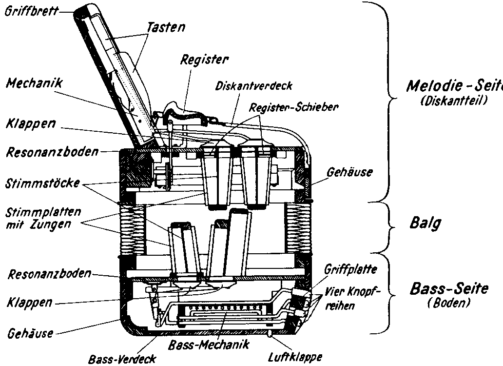 Die Abbildung zeigt einen Querschnitt durch ein (Piano)Akkordeon.