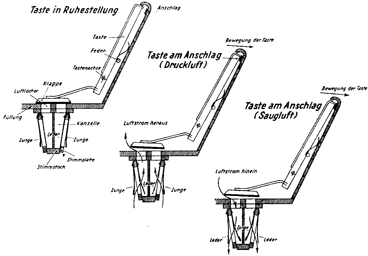 Die obere Abbildung zeigt den Weg des Luftstroms. Der Ton wird mit Hilfe freischwingender (durchschlagender) Zungen erzeugt.